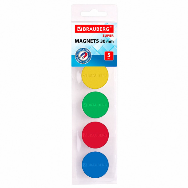 Магниты для доски цветные 30 мм,  BRAUBERG 'SUPER', Набор 5 шт., ассорти, 237478