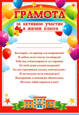 —Грамота 'За активное участие в жизни класса', (20 шт;уп), 0-634