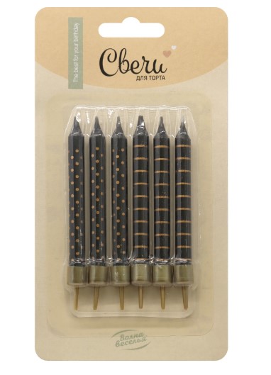 —Свечи Золотые точки и полоски, Черный, Металлик, 0,7х8 см, 6 шт. с держат, 802963