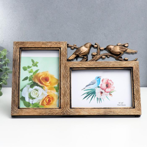 —Фоторамка пластик на 2 фото 'Птицы на веточке' (10х15 - 17,5х29,5 см), бронза, 3442381